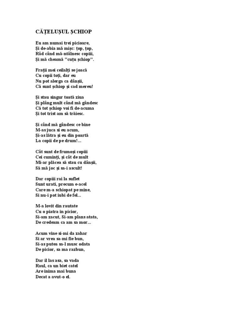 Trimit in tara, plata ramburs. Eu am numai trei picioare Catelusul schiop, elena farago, 23 poezii, stare buna. Acum ii dadea in fiecare zi. Catelusul a suferit toata ciata sa.